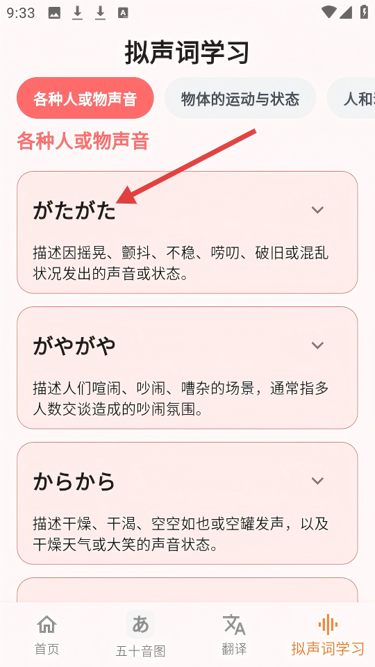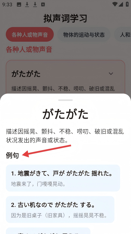3、在擬聲詞學(xué)習(xí)的【各種人或物聲音】分類下,點(diǎn)擊【がたがた】可查看其含義。