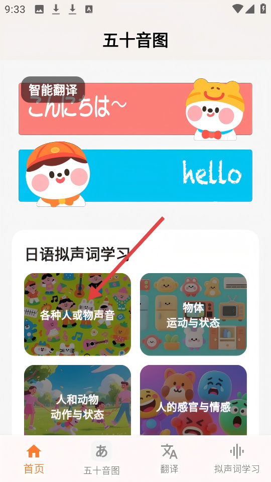 2、在首頁點(diǎn)擊【各種人或物聲音】,可進(jìn)入對應(yīng)擬聲詞學(xué)習(xí)板塊。