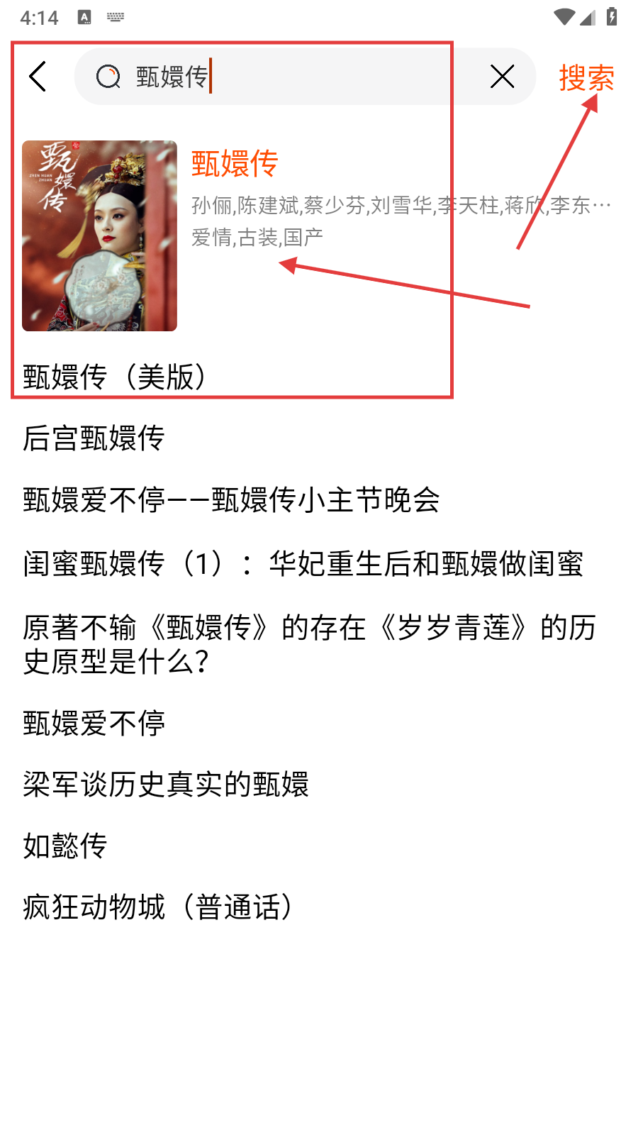 2、在搜索欄輸入【甄嬛傳】后,點(diǎn)擊右側(cè)【搜索】按鈕,在搜索結(jié)果中選擇對(duì)應(yīng)視頻。