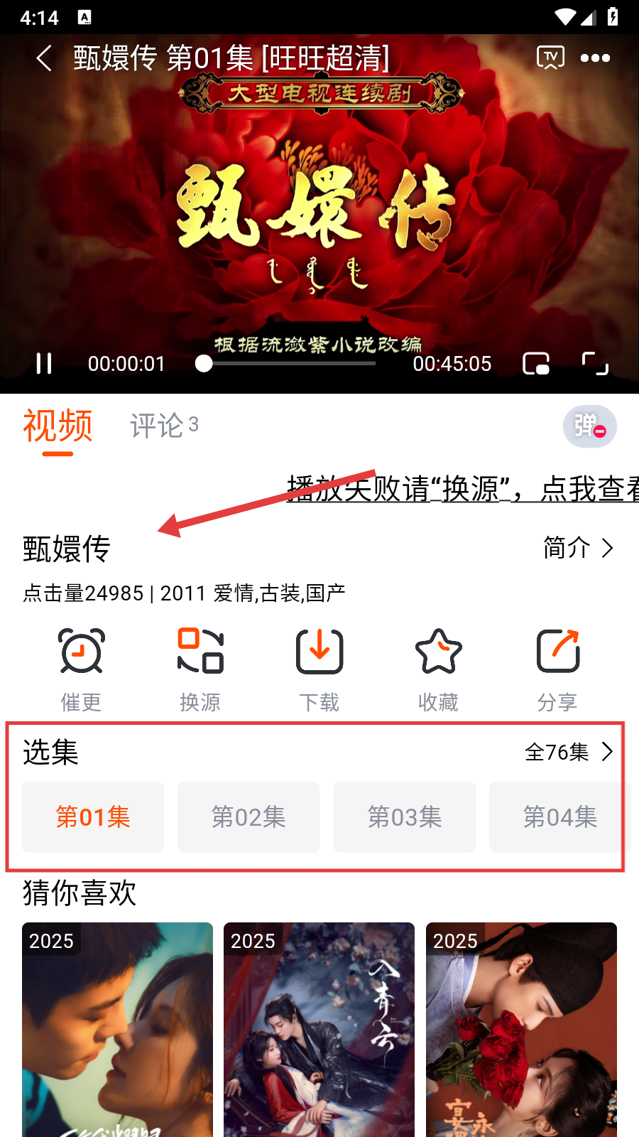 3、進(jìn)入【甄嬛傳】視頻播放頁面后,可在選集區(qū)域選擇第01集開始觀看,也可點(diǎn)擊【全76集】查看更多集數(shù)。