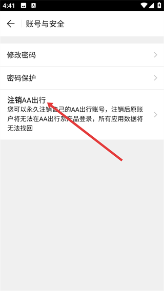 4、在賬號(hào)與安全頁面,點(diǎn)擊【注銷AA出行】選項(xiàng),可按照提示永久注銷AA出行賬號(hào),注銷后賬號(hào)數(shù)據(jù)無法找回。