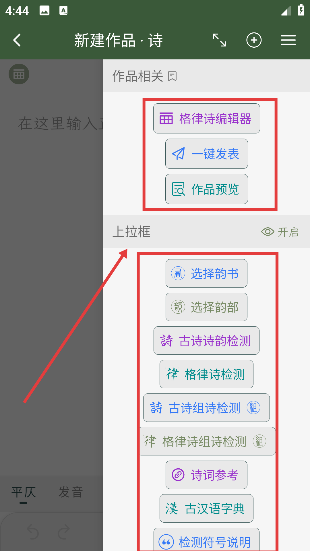 4、點擊右上角功能菜單,可使用【格律詩編輯器】【一鍵發(fā)表】【作品預覽】等功能,輔助完成詩詞創(chuàng)作與發(fā)布。