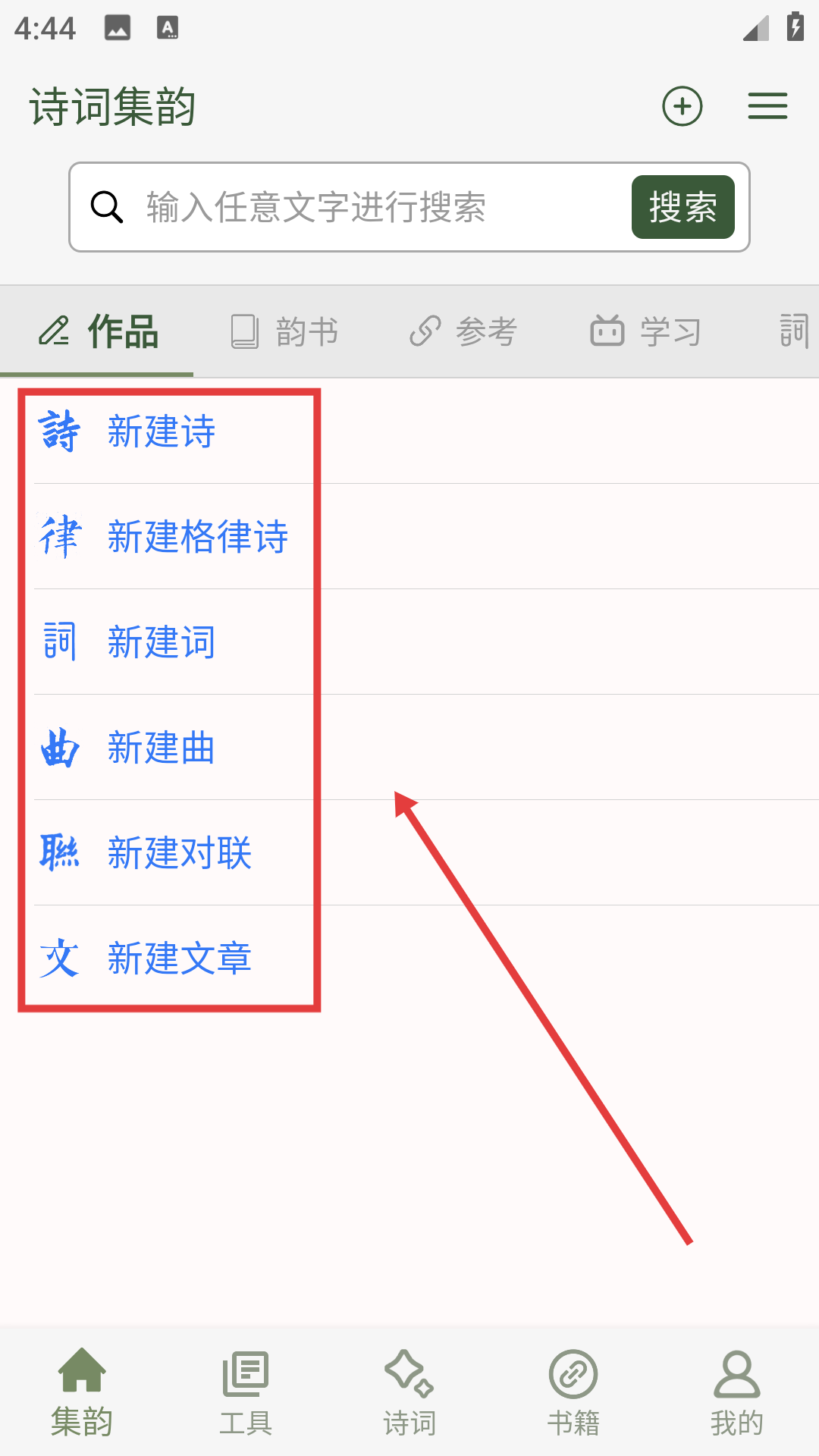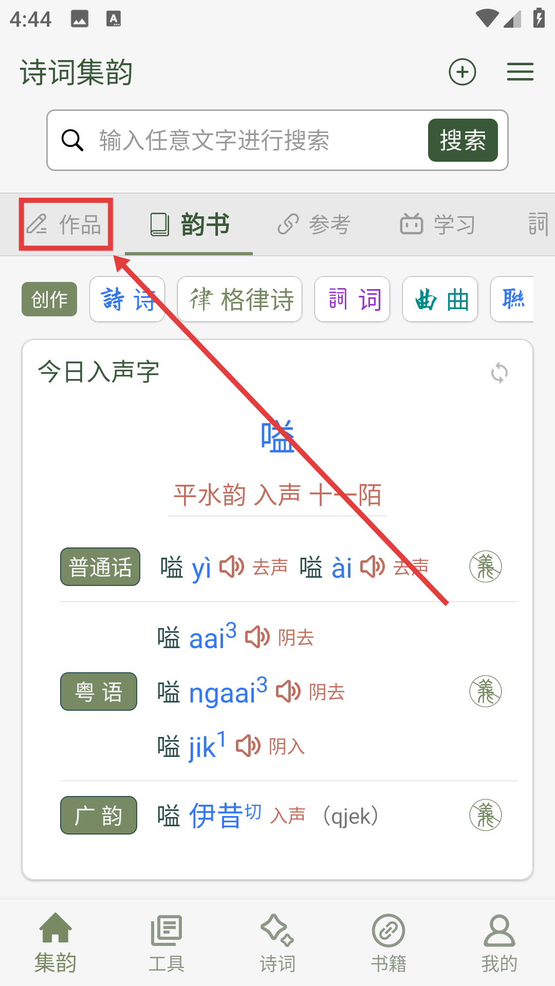 1、在詩詞集韻界面點擊【作品】標簽,進入作品創(chuàng)作選擇頁面。