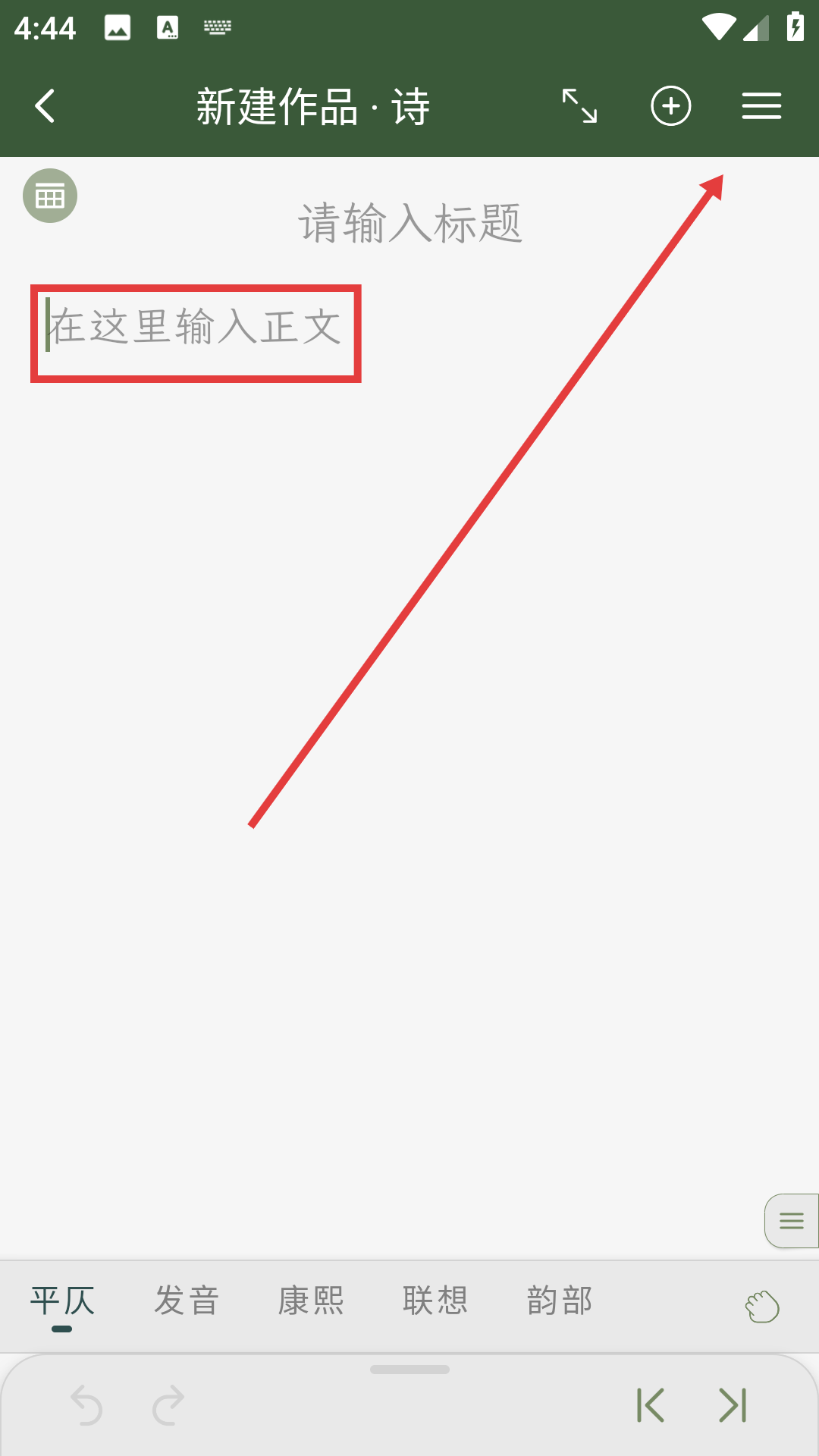 3、在創(chuàng)作編輯頁面輸入【標題】和【正文】,準備進行詩詞創(chuàng)作。