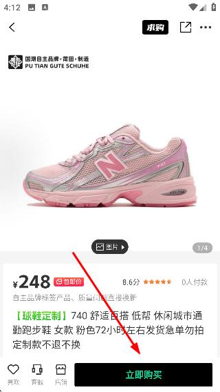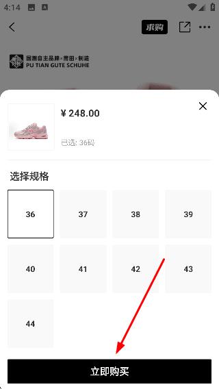 4、在規(guī)格選擇彈窗中選擇尺碼后,點(diǎn)擊【立即購(gòu)買】,完成購(gòu)買操作。