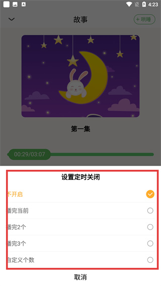 1、支持定時關(guān)閉功能,選擇故事播放后可設(shè)置定時,適配睡前場景,幫助孩子養(yǎng)成每日聽讀習(xí)慣。
