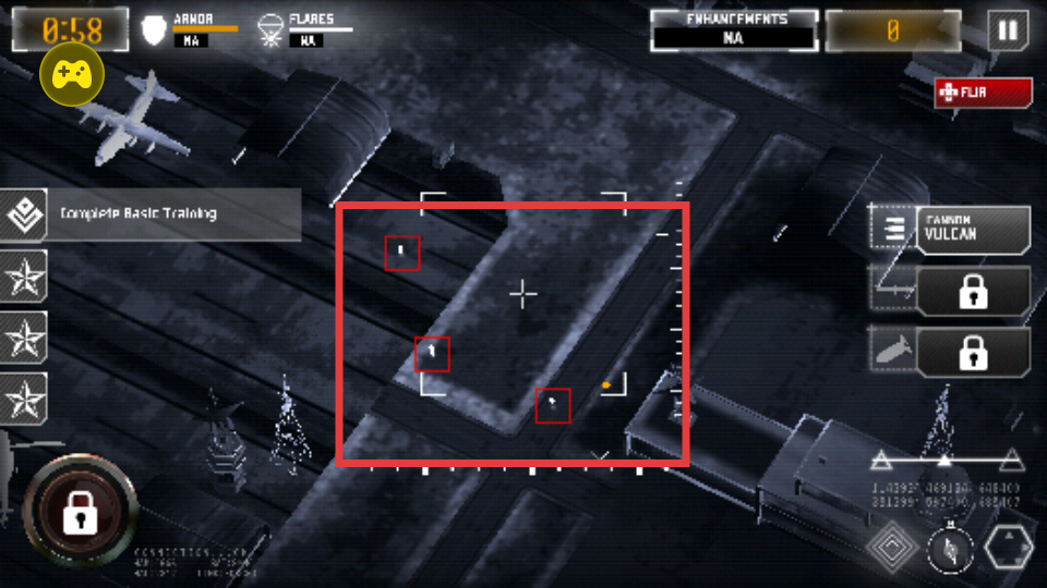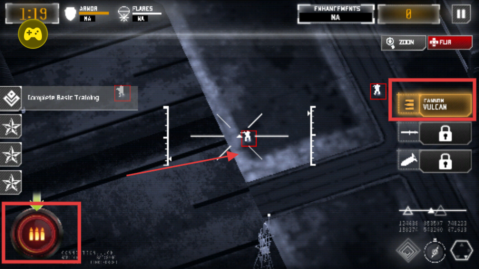 2、選擇【TAWKONVULCAN】等武器,點擊左下角攻擊按鈕,對鎖定的敵人進(jìn)行攻擊,熟悉不同武器的攻擊效果。
