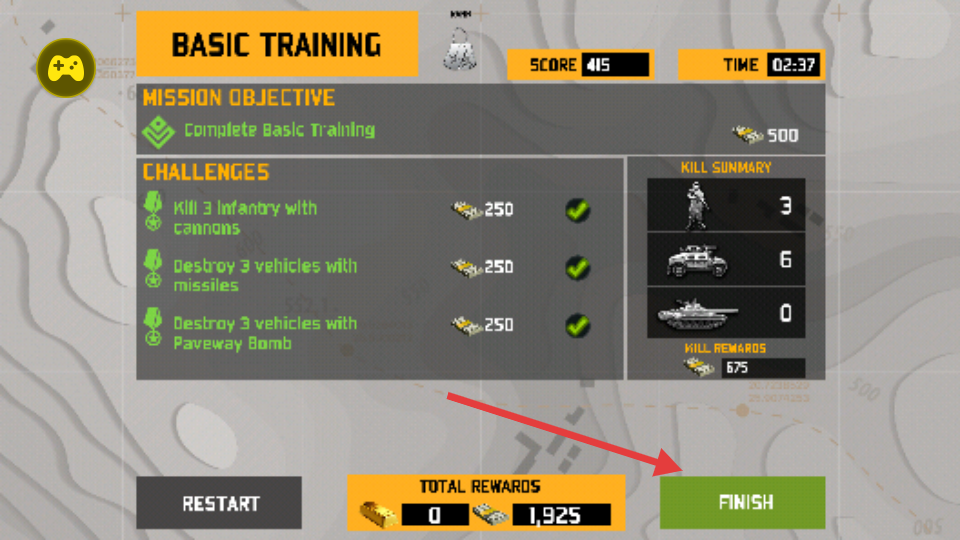 4、任務(wù)完成后,點擊【FINISH】領(lǐng)取獎勵,積累資源用于武器升級和解鎖新武器,提升后續(xù)任務(wù)的作戰(zhàn)能力。