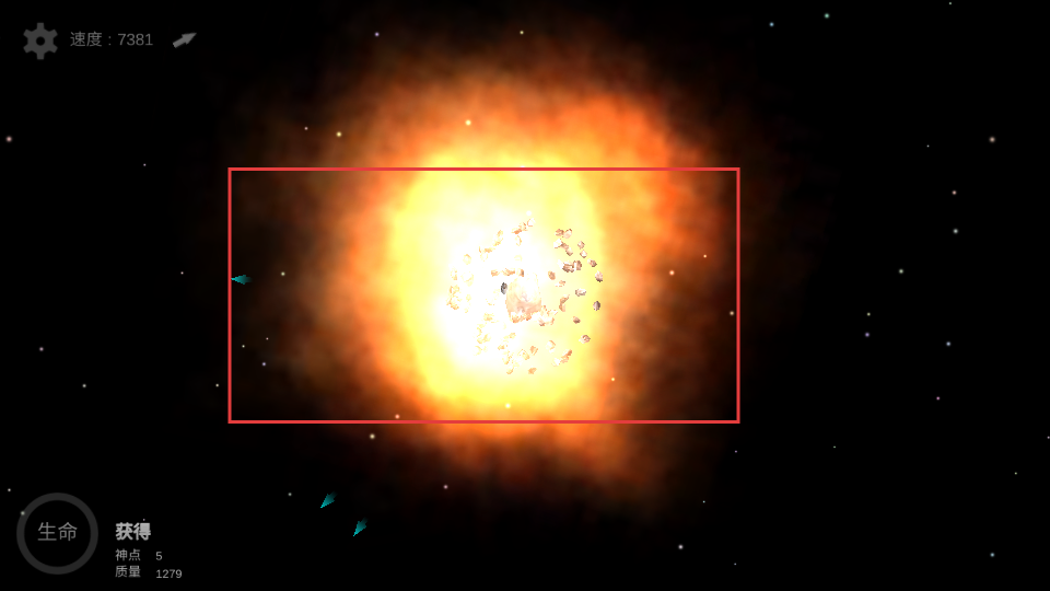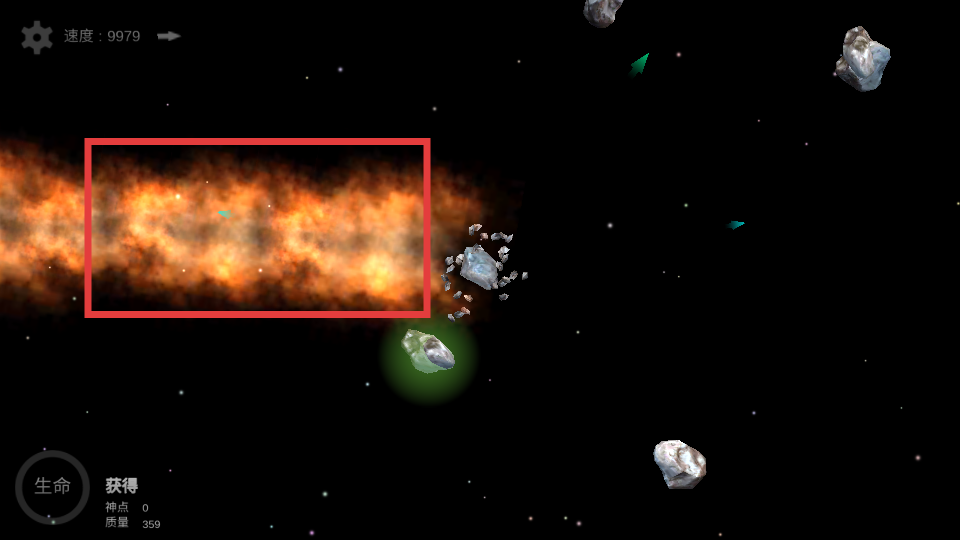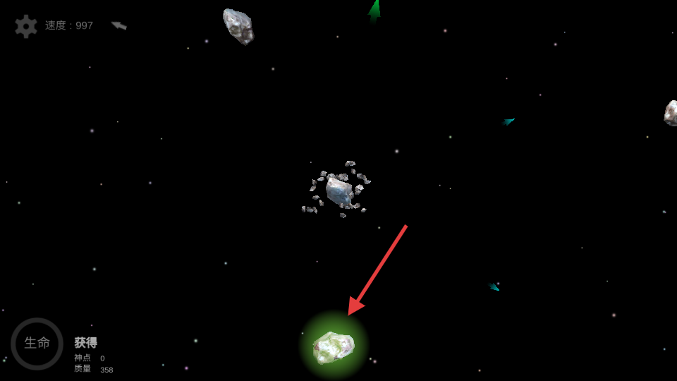 2、游戲中收集綠色發(fā)光的隕石,積累神點(diǎn)和質(zhì)量,提升自身屬性,增強(qiáng)在宇宙中的生存和發(fā)展能力。