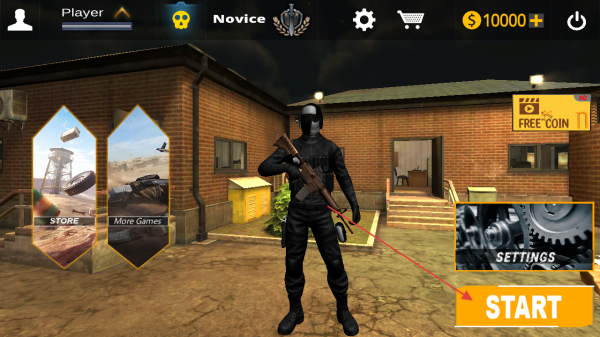 1、點擊【START】開始游戲,可先查看【STORE】和【SETTINGS】,了解游戲功能,為射擊任務做好準備。