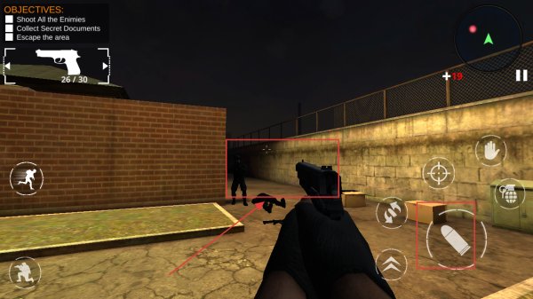 2、游戲中利用右側瞄準和彈藥鍵攻擊敵人,留意【OBJECTIVES】中的任務,在場景中尋找敵人并射擊。