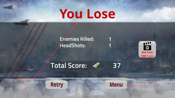 4、若失敗出現(xiàn)【You-Lose】界面,可選擇【Retry】重新挑戰(zhàn),總結戰(zhàn)斗經驗,提升射擊技巧和生存能力。