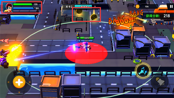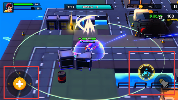 2、利用左側虛擬方向鍵移動角色,右側技能按鈕釋放攻擊,消滅所有敵人后推進關卡。