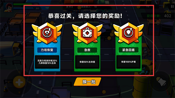 3、關卡通關后提供三種獎勵供玩家選擇,可挑選最有利的獎勵強化自身,為后續(xù)挑戰(zhàn)提供助力,提升游戲策略性。