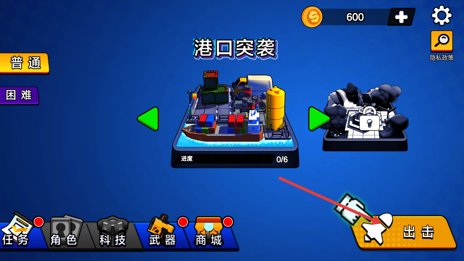 1、在關(guān)卡選擇界面,點(diǎn)擊“出擊”按鈕,進(jìn)入“港口突襲”關(guān)卡,開始戰(zhàn)斗。