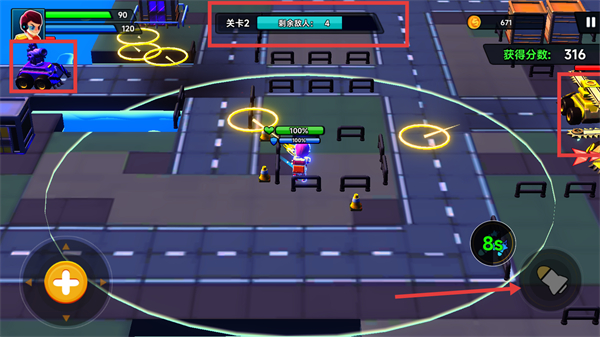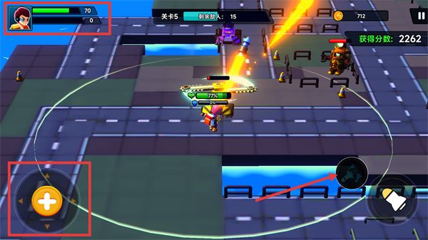3、進(jìn)入關(guān)卡5后,關(guān)注生命值,利用左側(cè)虛擬方向鍵移動(dòng),右側(cè)技能按鈕釋放攻擊,消滅15個(gè)剩余敵人。